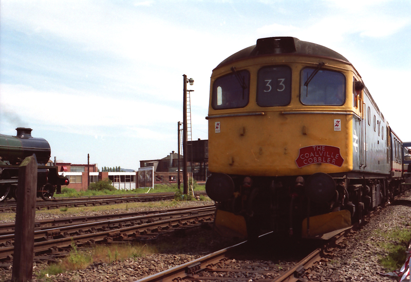 The pilot engine which was already waiting impressed few, 31454 was eventually attached to haul the tour half a mile or so to Abbey Jn, where we reversed with 33058 taking over Nuneaton flyover and freight route to the Leicester line. This unexpected bonus although it cost us lost time was a real bonus, possibly the last ever 33 over Nuneaton flyover as it closed not long after. The reopened Nuneaton flyover which had considerably less freight only mileage reopened in 2004 and i assume a “Crompton tour” has now done it again. 33058 gamely thrashed East and North through the rare Crompton haunts of Hinkley and Narborough before turning left at Knighton South Jn for the stagger along the 20mph restricted Coalville branch..