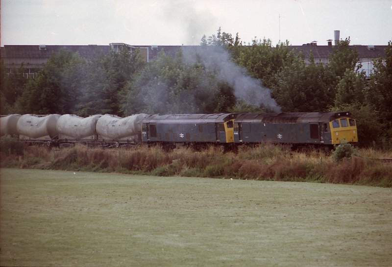 Tony Ewer catches some “rat” exhaust as 25089 and a failed 25242 accelerates away from the catch points at Dunstable on August 2nd 1983