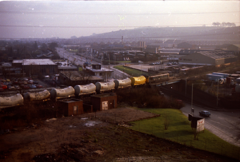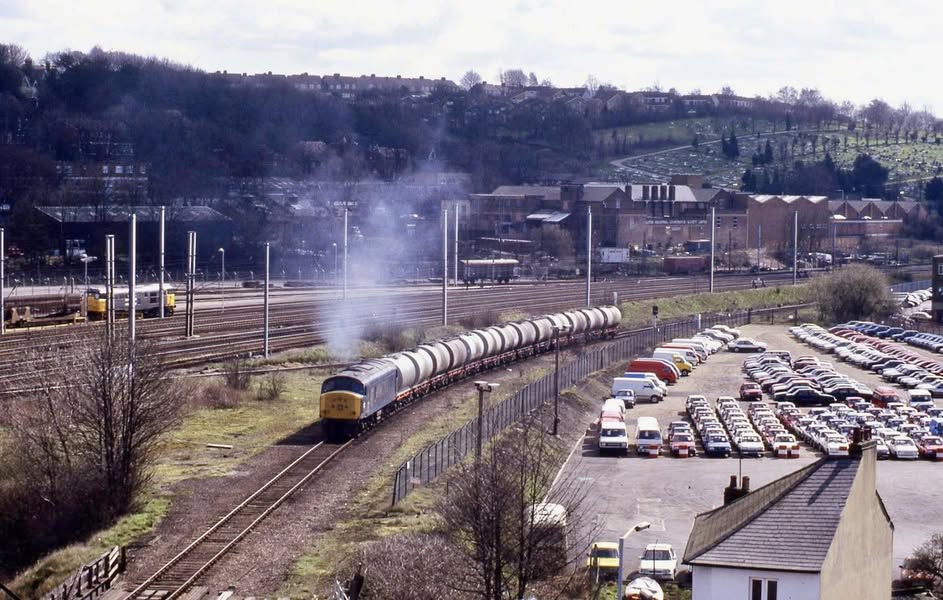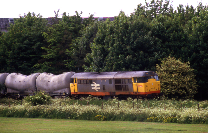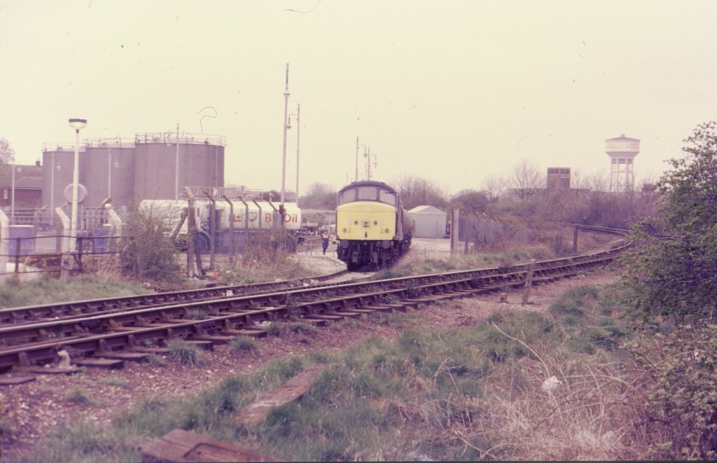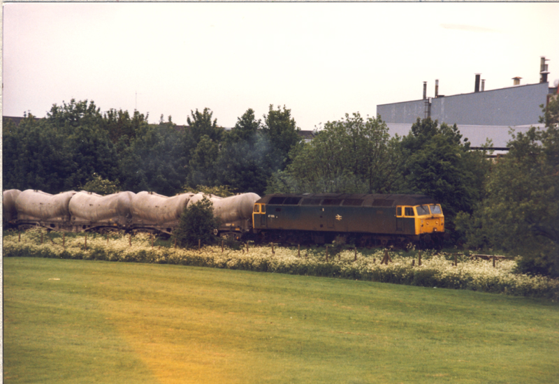 45056 passes the staff car park at Reed Travel Group with empty oils from Dunstable to Ripple Lane, the “Peak” will probably work this to Brent yard, on October 6th 1982