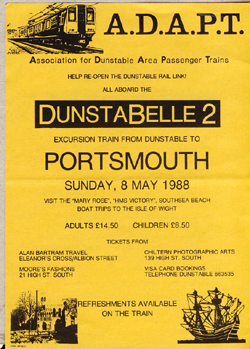 An ADAPT flyer for the second special from Dunstable on May 8th 1988 to Portsmouth