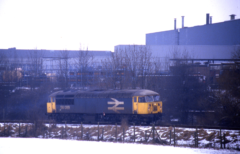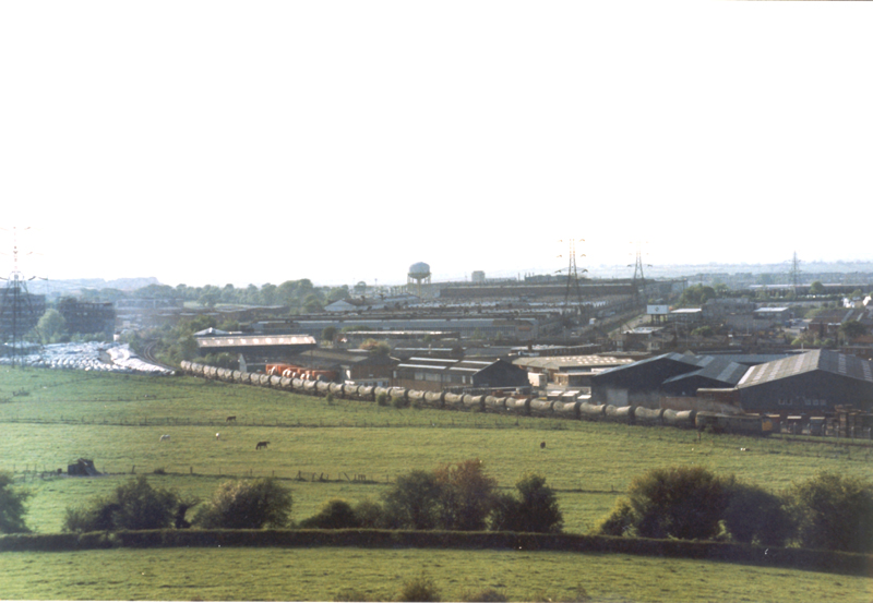 Tony Ewer advises that presumably as an experiment 56089 worked 18 loaded bogie cements trucks down the branch in one go one Sunday morning in Feb 86. The train was presumably split into portions on the loop outside the oil depot before being propelled onto the triangle. This was to prove a unique one off working.