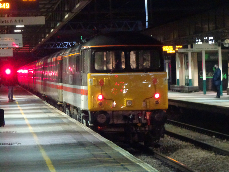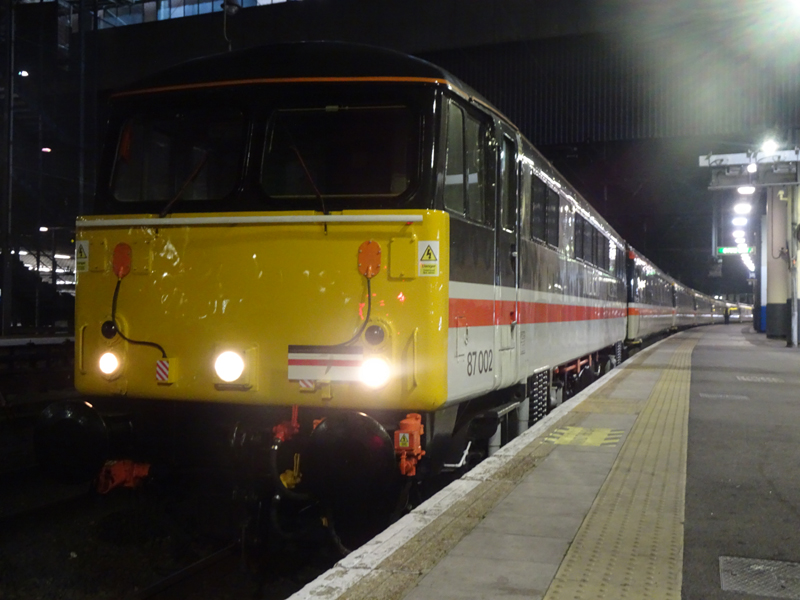 After a haggis supper i escaped the rain back at Central and we all admired 87002 arriving on platform 2 with the tour stock. We departed at 1600 and proceeded in darkness to storm South. A rare track (for a 87) booked diversion took us via Euxton Balshaw Lane before rejoining the main line at Wigan NW.