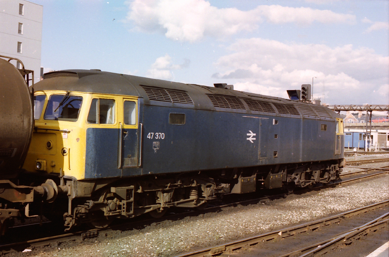 47370 awaits a new crew on the centre road at Nottingham with 6E50 Langley – Immingham on August 24th 1985