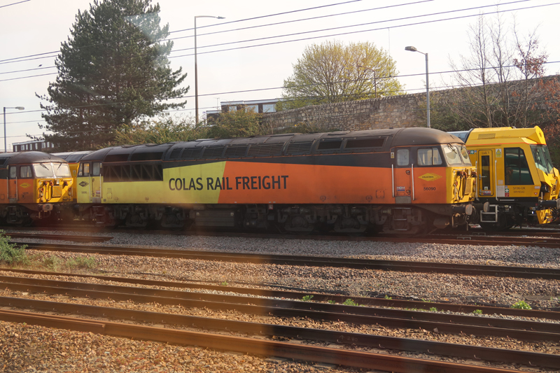 Looking good in Colas livery 56090 and the nose of 56096 South of Doncaster station