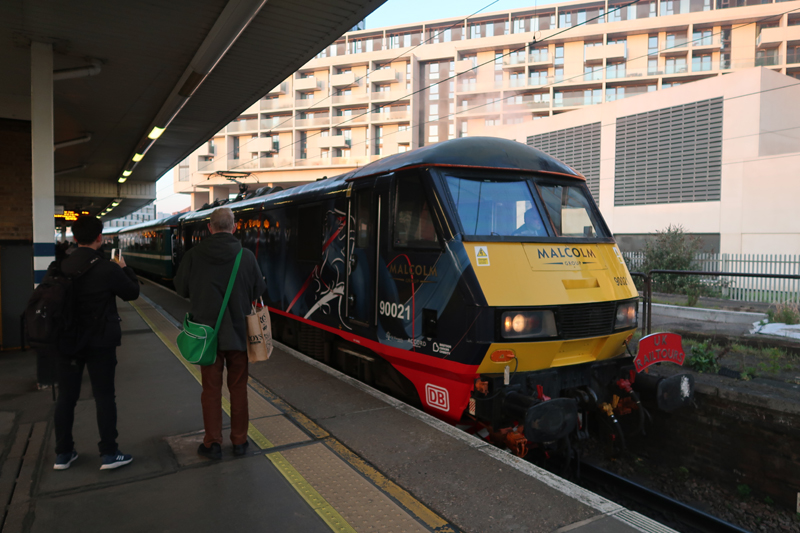 Malcolm liveried 90021 arrives virtually right time at Finsbury Park with the tour at 0642