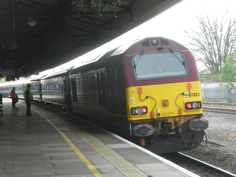 Leighton Buzzard High St around 0640 was the unlikely starting point for me and Tony Ewer before joining the bus to Aylesbury. A busy green bubble 55034 was then joined for a rattle and roll across the Chiltern foothills. A short wait on a now bright morning then the trusty, ultra reliable “Banbury commuter” regular 67023 worked hard leaving Risboro on the too brief climb to Saunderton bank.