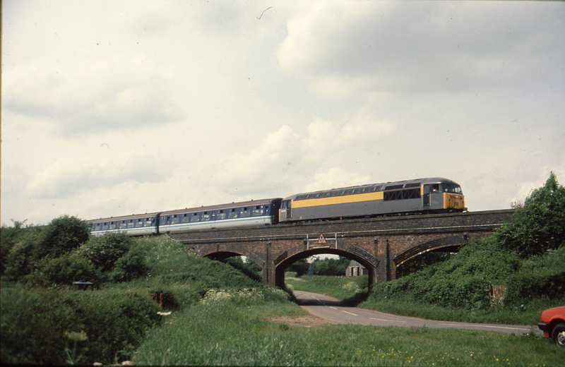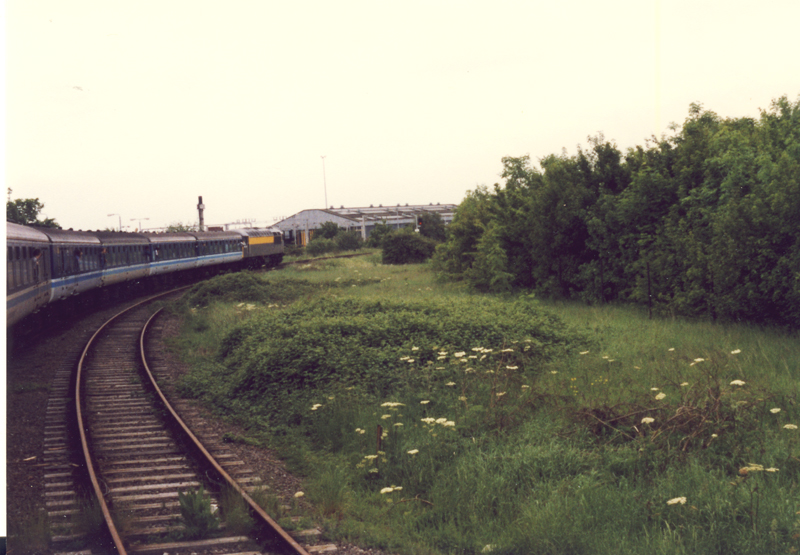 We then joined the Oxford-Bletchley for the last time. As usual this was a 25mph stagger but the atmosphere was good doing such rare track.With the Claydon-Bletchley section “mothballed” after this weekend this was to be the last passenger train over the Bicester – Claydon line and the last loco hauled tour over Bletchley flyover. A Branch line Soc DMU tour the following Bank Holiday Monday worked the Bletchley-Claydon section on an itinerary that included the Wolverton Works “diveunder”. Once busy with stone traffic, the ending of the Wolverton ARC traffic the previous year and curtailment of the Akeman “UKF” traffic a few weeks earlier meant the Bicester- Bletchley line had no regular traffic and closure was inevitable in a privatised railway environment.