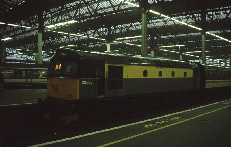 From the late Tony Ewer is this gloomy view of 33026 at the blocks of Waterloo with the Overnight Bag tour of April 26th 1987. 33026 had worked the tour from Kensington Olympia via the rare Latchmere curve.