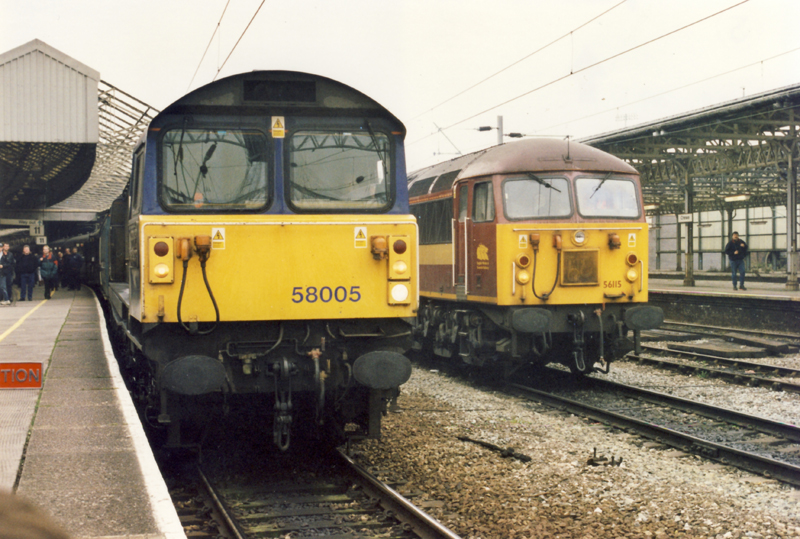 Two of the tours three locos are seen at Crewe, 58005 which had worked from Watford Jn to Crewe with 56115 which was to be dead in tow behind the 92 on April 1st 2000