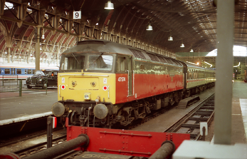 Former Stratford machine 47574 at the blocks at Padd with the tour ECS alongside the cab road