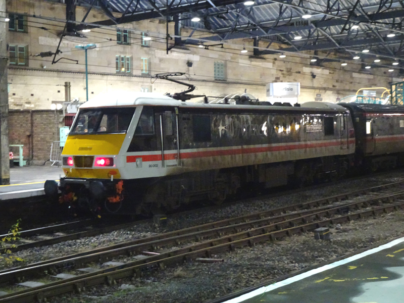 Our Northbound progress remained fast on tight timings, no Pendos were to overtake us till Rugby on the return trip. Unfortunately at Oxenholme we caught up a down Intermodal hauled by 88009 only passing it at Kingmoor. Unfortunately the ugly face of Covid returned as we arrived at Glasgow Central for a “20 minute leg stretch” , because of tighter restrictions North of the border the doors were not released! Kind tour staff borrowed punter’s cameras to phot the 90 at the blocks for them, nobody complained we were just glad to be out for the day! So after watching various ugly and empty looking new units to and froing we departed South from central