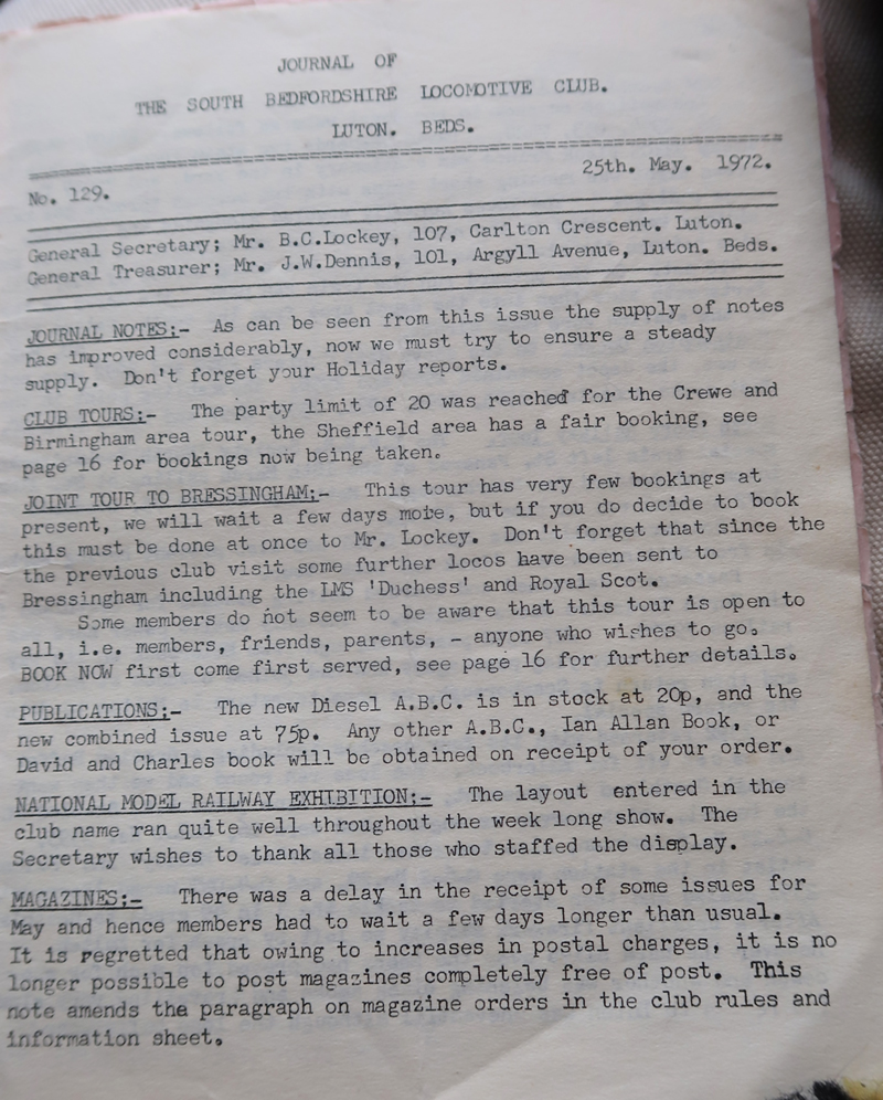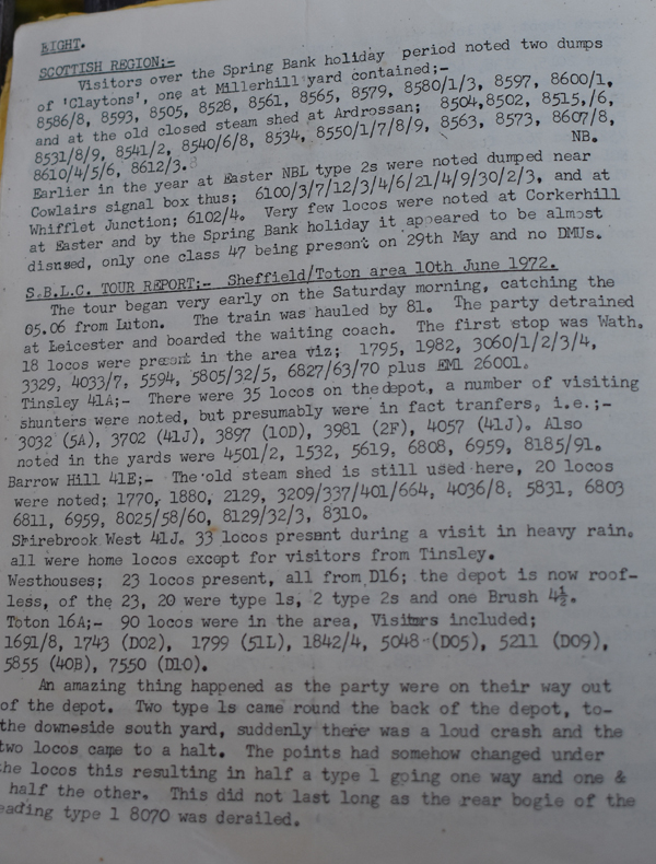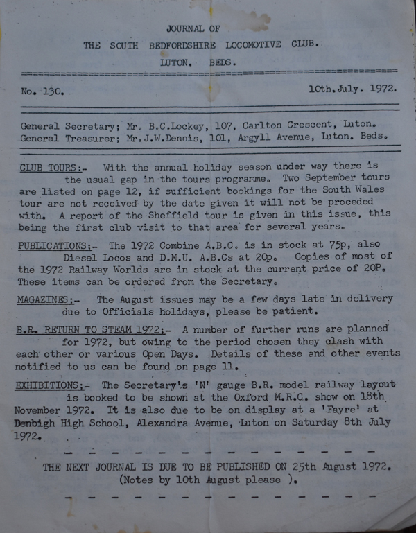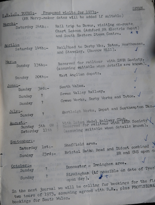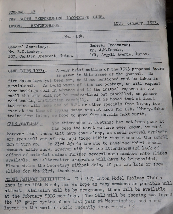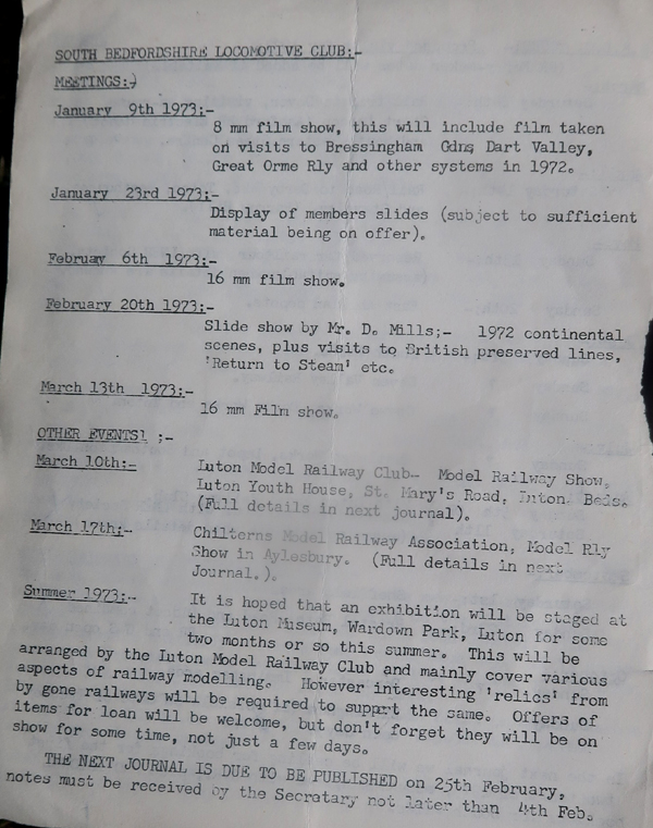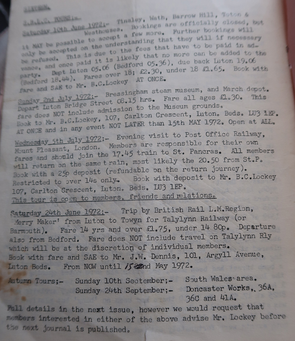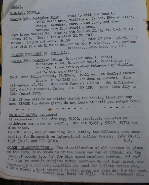 Uncovering one shoe box marked for “relocation” saw at the bottom, neatly protected in a plastic wallet were 6 SBLC Journals dating from 1972-1974. Tidying up finished! I engrossed myself in the feast of early 70s gen, an interesting mix of local and not so local information. I was a member of the SBLC for a few years in the early 70s doing a good few of the SBLC depot tours by coach and train. In the 60’s the SBLC had run 1 or 2 classic Railtours each year using power and track long confined to history by 1972.