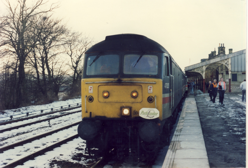 At Sheffield 47829 was removed for 25322 “Tamworth Castle” to work forward. A bit of thrash could be heard as we climbed over Edale, a photo stop at a still unspoilt “real” Manchester Victoria allowed a welcome leg stretch. Once past Bolton 25322 began to chatter nicely on the long climb to Blackburn with snow, quite thick on the ground. Past Clitheroe and into Hellifield where once again we had a lengthy photo stop in the snow with freedom to wander where you want. 47829 had followed the tour from Sheffield and was coupled to the rear of the stock at Hellifield.
