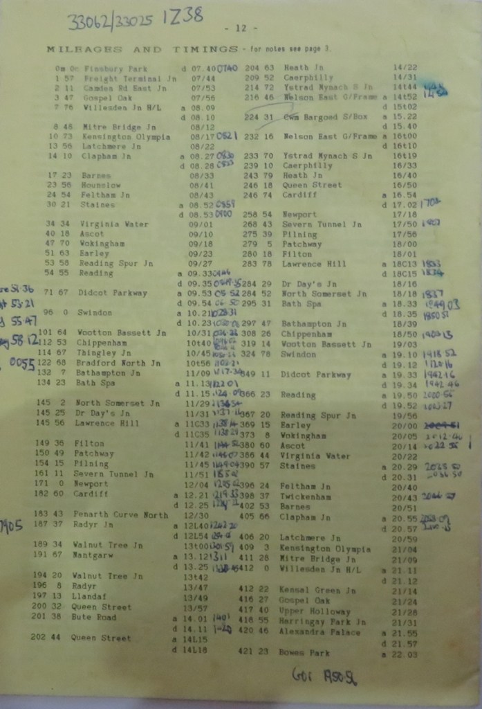 The booked Staines stagger then a GW mainline thrash to Chippenham, then Melksham, Bath, Cardiff and onwards to Radyr. Near Bath we crossed to much flailing the rare 33048 on 1O39 1007 Cardiff Portsmouth. At Radyr the rumoured very average, dud 37/4 allocated to the tour was stabled, but newly repainted Railfreight large logo liveried 37905 “Vulcan Enterprise” was attached to the rear. At least this was required for new number, she was formerly the common 37136.