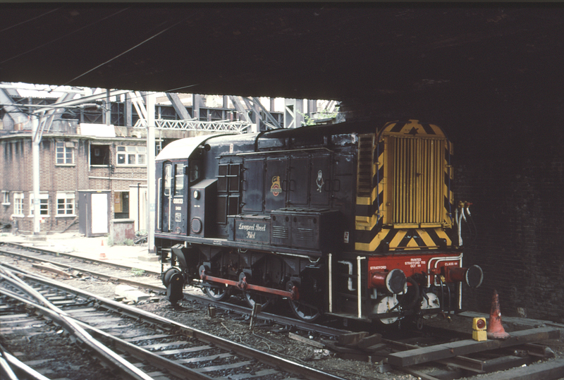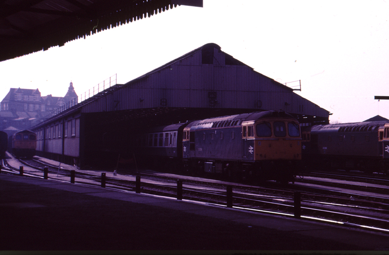 33208 on a rake of Mk I’s in the carriage shed at Clapham Jn on April 17th 1987