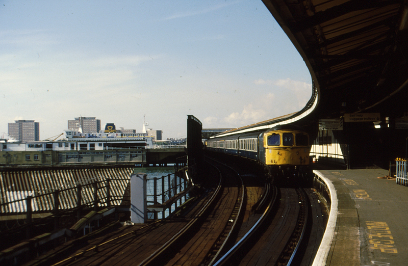 33026 with an IOW ferry in the background as the 33 awaits departure time from Portsmouth Harbour on the 1210 Cardiff on September 25th 1987