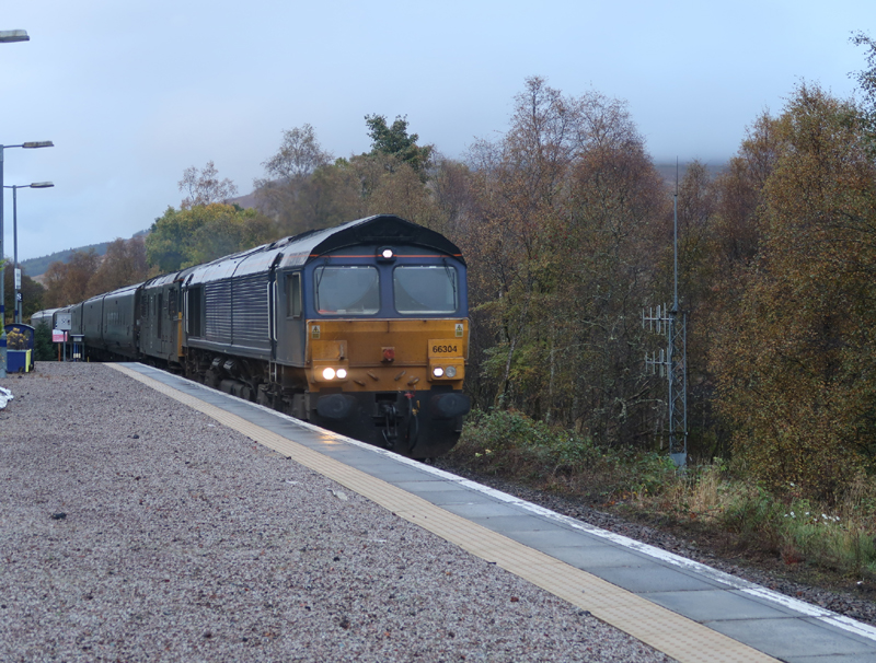The current scene, 66304 and 73970 arrive at a deserted Tyndrum Upper with 1Y11 0450 Edinburgh – Fort William which includes a day coach added at Edinburgh to the overnight Caledonian Sleeper from Euston to Frt William/Aberdeen/Inverness on October 8th 2024