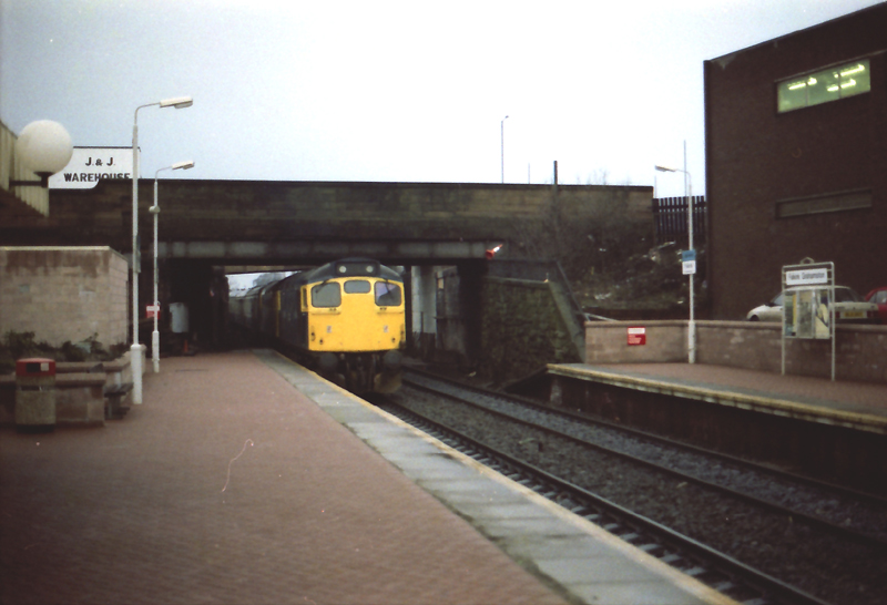 27046 and 27049 arrive at Falkirk Grahamston with the SRPS “Tyne Valley Express” tour on March 14th 1987