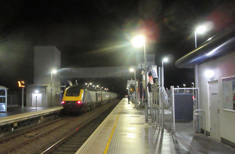 43148 tails the 1720 Inverness – Aberdeen out of Forres. The tram, as booked has used the less regularly used platform 2 rather than the common platform 1. Back in the day we bailed at the old Forres station rather than avoid the tight/near impossible Elgin bail.