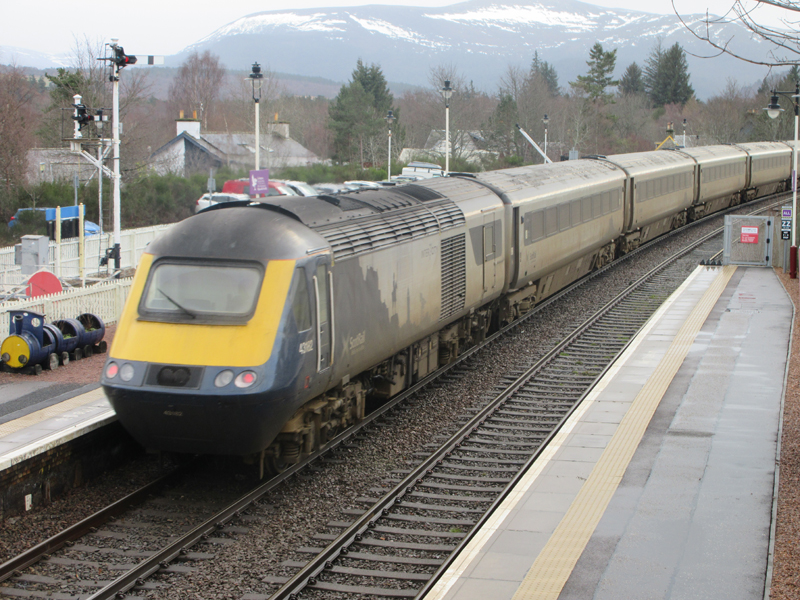 Making quite a racket 43182 is the tail power of the 1248 Inverness – Pitlochry leaving Aviemore, the tram was terminating at Pitlochry due Highland Line flooding