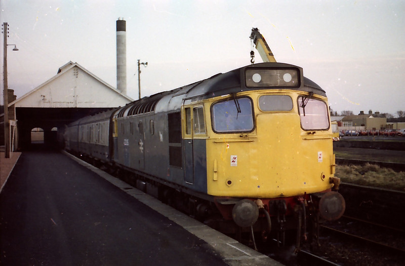 Far North “tippie”. 27055 at Wick prior to working 2N37 1800 Wick – Inverness on January 29th 1985. Due severe weather many type 2’s were covering for absent 37’s. 27055 worked solely Wick-Inverness that evening, her boiler a strong one.