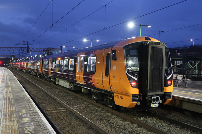 In light snow 730020 and 730006 await departure time from Tring with the 1641 to Euston on 080124, this was 730020’s first day in service and was wedged with bashers!