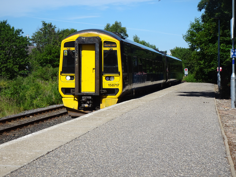 Warm sun at Tain as 158717 arrives with the 0802 Wick – Inverness on July 1st 2021