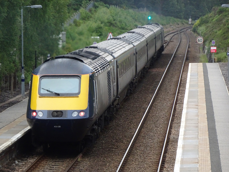 43138 leaves lonely Carrbridge (43035 up front) with the 1727 Inverness – Glasgow on July 3rd 2021