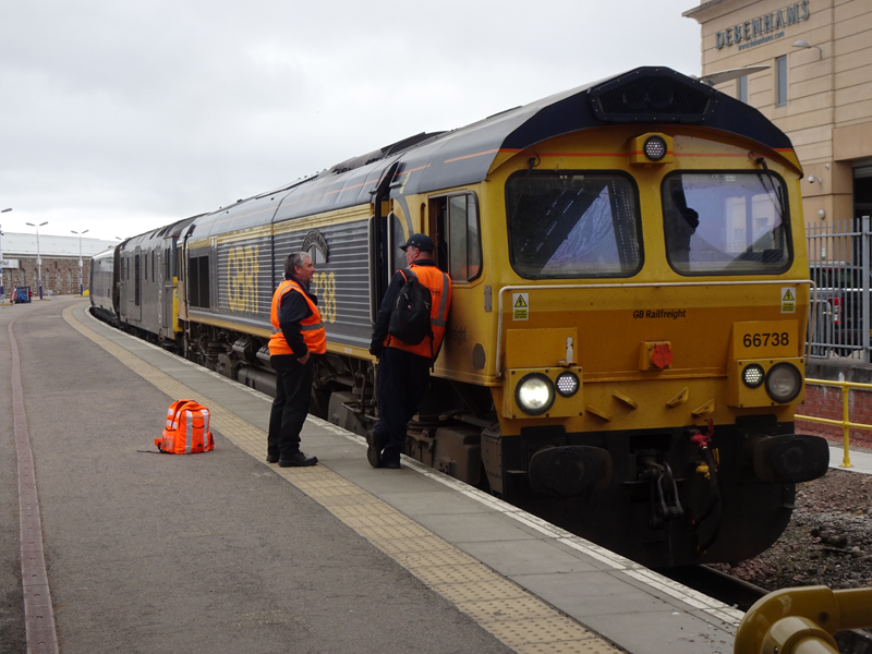The Drivers of 1S25 “Caledonian Sleeper” from Euston are deep in conversation as their power from Edinburgh with 66738 and 73971 looking good on June 30th 2021