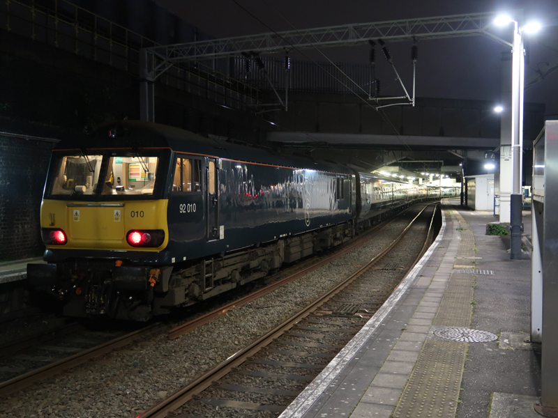 92010 at Euston prior to departure with the 14 coach Euston – Inverness/Aberdeen sleeper on March 18th 2024