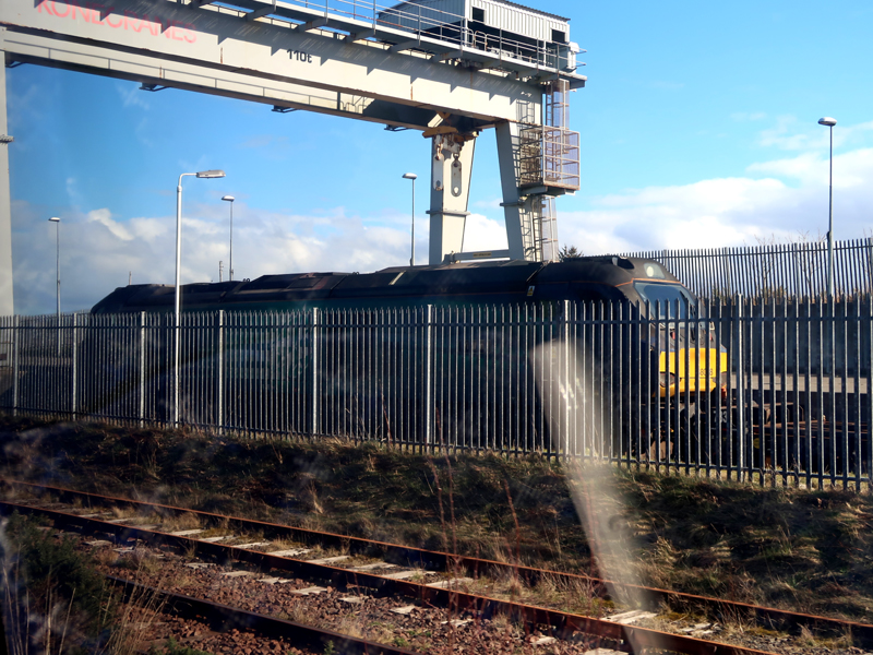 Apologies for quality but 68018 is photted under the loading gantry at Georgemas Jn with a nucleur waste train to Sellafield on March 20th 2024