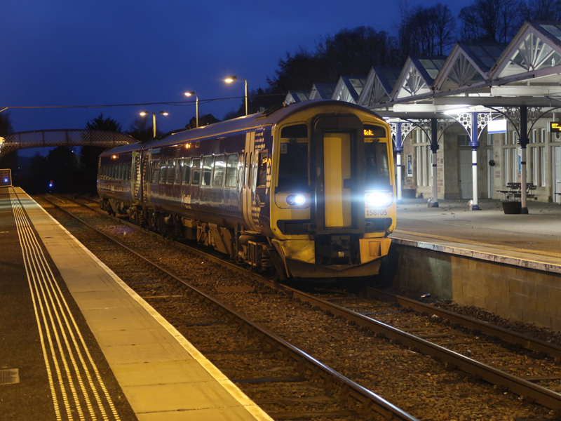 158705 at Dingwall with the late evening Inverness – Wick on March 21st 2024