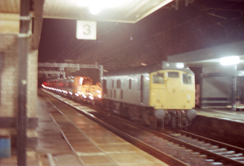 I got down the station just after 6am and was pleased to be advised the juice was still off in the problem section. The silence was shattered by 25193 and the rare 25109 storming South on a sleeper/night rider service. A 310 arrived from Tring and was taken to M. Keynes. This was my first dud move of the day, as unbeknown to me, the hauled G06 Euston-Birmingham turn was running and called at Leighton. The drag power to Bletchley was 47314, this loco having done more passenger turns in the last 24 hours than in the whole of 1983… .Anyway I viewed it heading North l/e at the Keynes apparently returning to it’s booked oil train duties from Bedworth to Immingham.